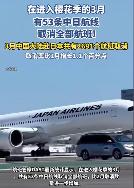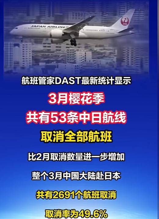 3月反制再上新台阶,取消赴日航班2691班,取消率逼近五成,53条中日航线全线停飞,北京—冲绳、上海—名古屋等热门干线彻底“清零”。
