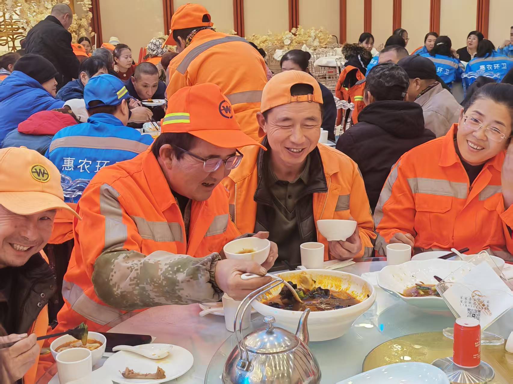 临近中午,结束了一上午繁忙工作的环卫工人们陆续抵达,围坐在一起,一边品尝着皮薄馅大、鲜美多汁的饺子,一边开心地唠着家常,分享工作中的趣事与生活里的点滴,活动现场欢声笑语不断,气氛融洽。